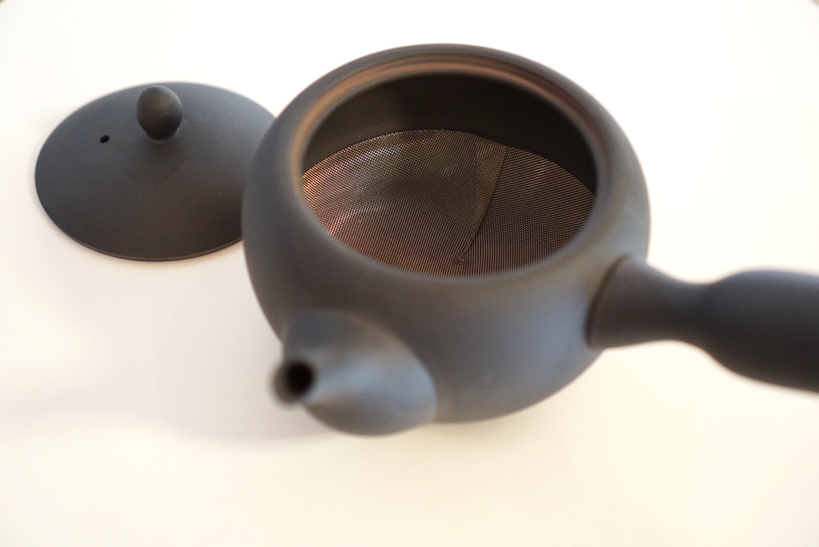 フタを取るとステンレスの網が底から1㎝くらいの高さに敷かれた形になっていて、お茶を淹れるときは茶葉が急須内でのびのびと回ります。片付けるときは網に茶葉が詰まらず、さっと水ですすぐだけで茶葉を取り除ける優れものです。手作業を主にした製作で、本体や持ち手、注ぎ口とパーツごとに作ったものを接合させてつくられています。それぞれのパーツに高い完成度が求められるので、熟練の技をもってしても完成するまでに1ヶ月程かかっているんだそう。四日市のきめの細かい土で作られた手に馴染み、実用性の高いおすすめの急須です。せっかくお茶を淹れるんだったら茶器も気に入ったものの方が気分が上がりますよね。お店(FM STORE)でもお取り扱いしてますので、気になられた方はぜひ手に取ってご覧ください。